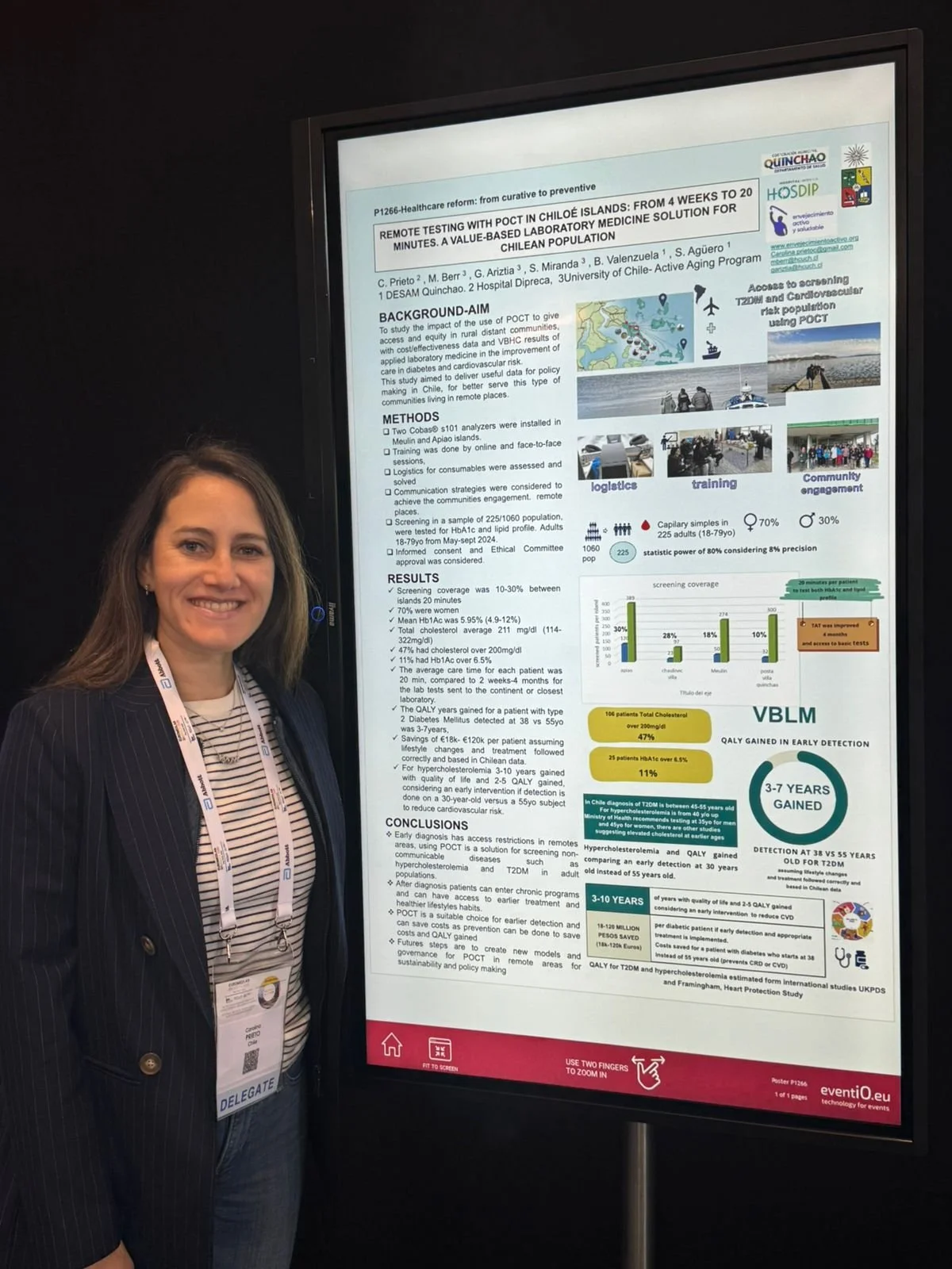 Bruselas, mayo de 2025: El estudio desarrollado por la doctora Carolina Prieto consiste en la detección temprana a través de Point of Care Testing de perfiles lipídicos y hemoglobina glicada alterdados en lugares remotos y de difícil acceso, específicamente en la población de las islas de Quinchao. Detectamos un 47% de hipercolesterolemia y 11% de pacientes con hemoglobina glicada alteradas. El este estudio se enmarca en el pilar de control de enfermedades crónicas no transmisibles del programa EAS y fue clasificado bajo la categoría “De lo curativo a lo preventivo” en el Congreso.